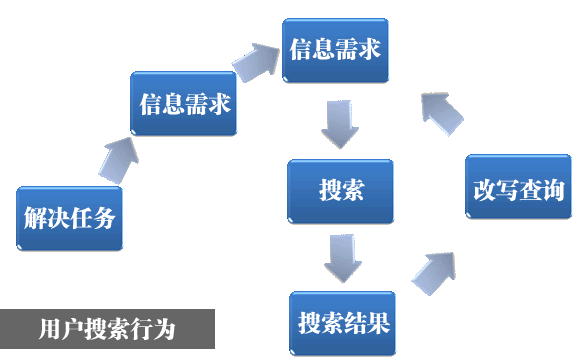 用户之所以会产生搜索行为,往往是在解决任务时遇到自己不熟悉的概念或者问题,由此产生了对特定信息的需求,之后用户会在头脑中逐步形成秒速需求的查询词,将查询提交给搜索引擎,然后对搜索结果进行浏览,如果发现搜索结果不能完全解决用户的信息需求,则会根据搜索结果的启发,改写查询,以便更精确地描述自己的信息需求,之后重新构造新的查询需求,提交搜索引擎,如此形成用户和搜素引擎交互的闭合回路,直到搜索结果已经解决了自己的需求或尝试几次无果而终。